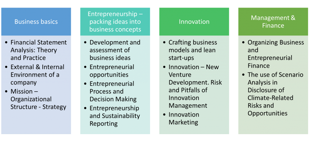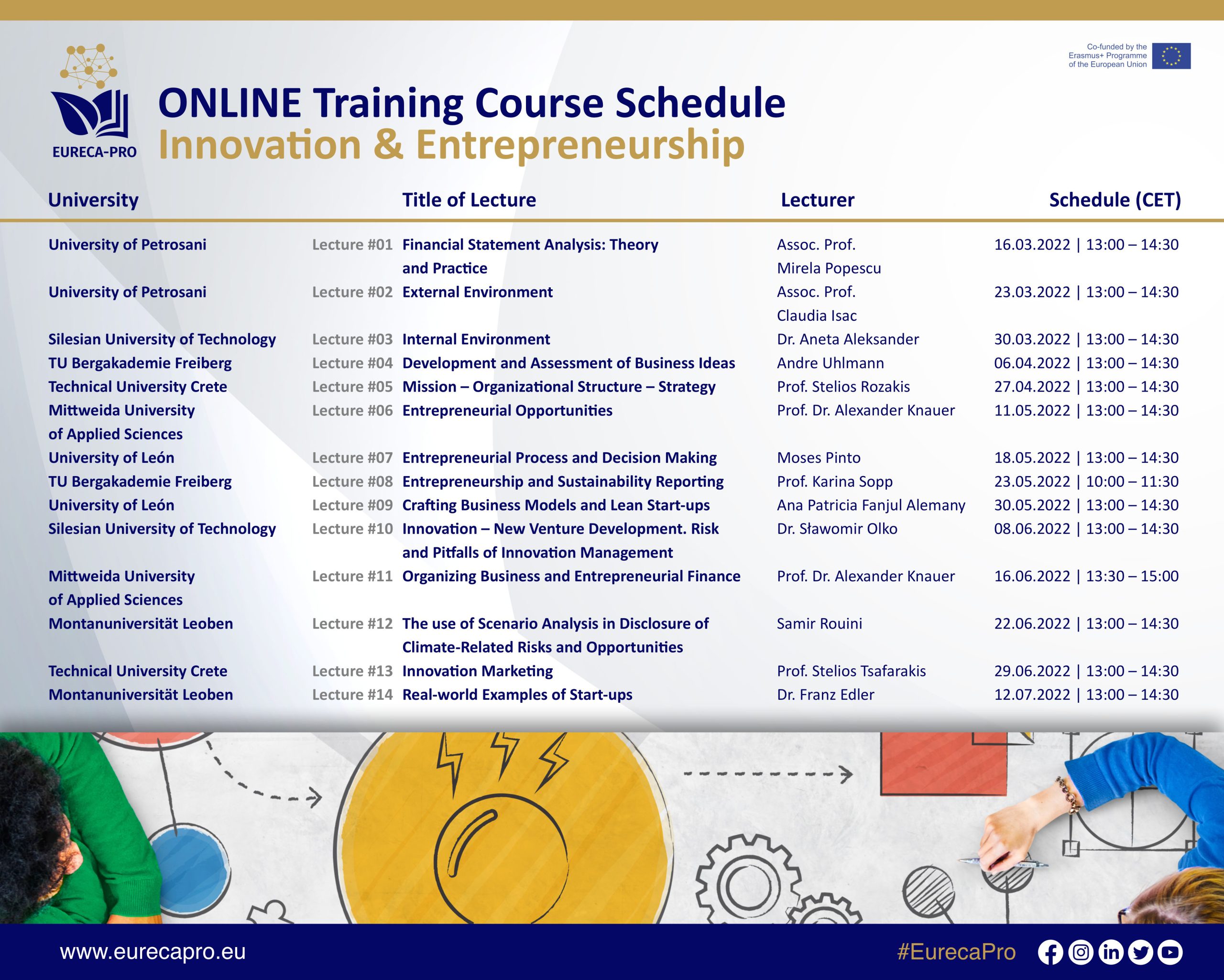 EURECA-PRO/European University on Responsible Consumption and Production is initiating a free online course on “Innovation & Entrepreneurship”, consisting of 14 lectures presented by leading professors and researchers of seven European universities from six countries. The main purpose of the “Innovation and Entrepreneurship training course” is to nurture students and scientific staff in creative and innovative thinking by providing practical knowledge, skills and competences in business and market basics, offering business plan orientation, and promoting problem-solution thinking and leadership skills. The following thematic areas will be covered: