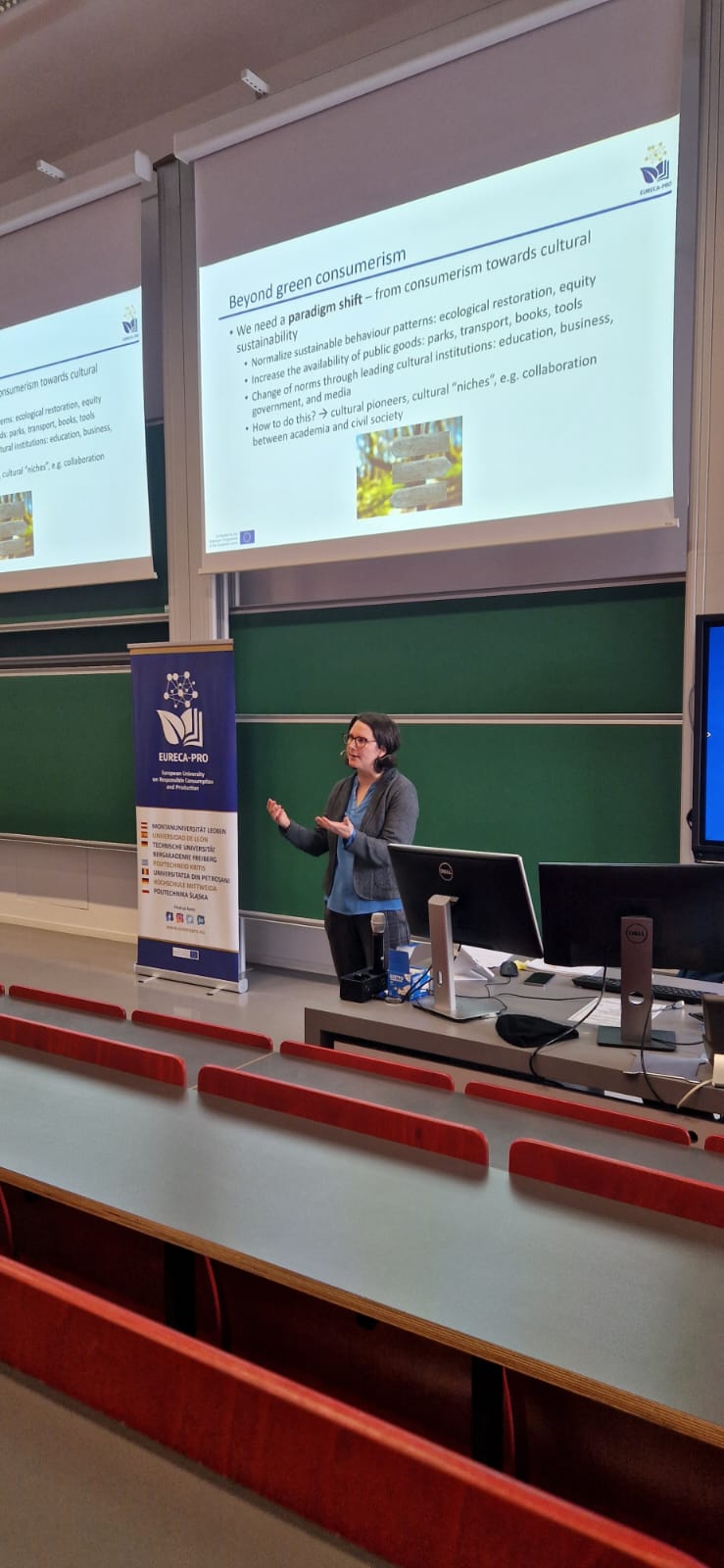 On day two, the lecture „How to consume more sustainably” offered insight into the topic of responsible consumption and cultural differences with regard to consumption behaviours. Afterwards, the EURECA-PRO team organised a meet and greet event in the Akademie building with free coffee and snacks.